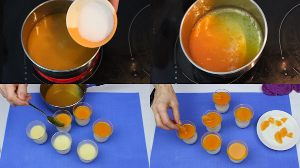 Lo dejamos templar y terminamos de rellenar los vasito son él. Los adornamos con un gajo de mandarina y los volvemos a poner en el frigorífico hasta el momento de servirlos.