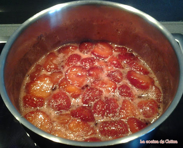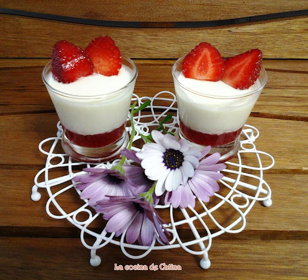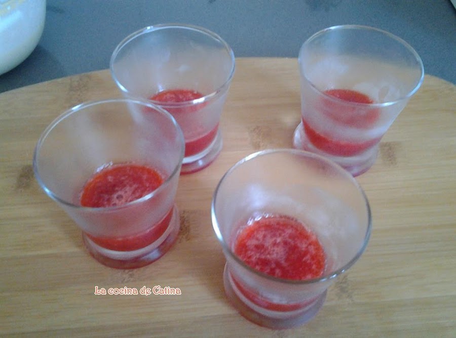 Verter sobre la confitura de fresa con cuidado para evitar que se levante, refrigerar hasta la hora de servir (para que coja consistencia, es mejor prepararlas el día anterior) y decorar con fresas.
