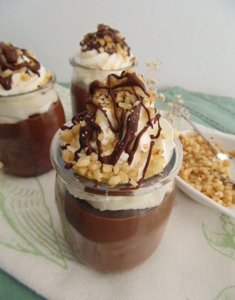 Entonces es el momento de retirarlo del fuego. Vertemos en nuestros vasitos. Dejamos un par de centímetros libres para el copete de nata (crema de leche). Templamos y una vez tibios cubrimos y llevamos a la nevera unas horas o toda la noche.