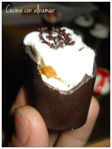 Me hubiera gustado rellenarlos de mousse de chocolate pero viendo la ingesta de comida que se hacen para estas fiestas decidí rellenarlos de nata (crema de leche) y trocitos de melocotón en almíbar algunos.