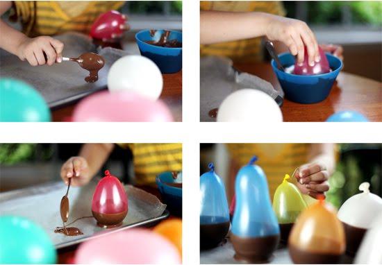 4. Introducimos el globo en el chocolate derretido e intentamos que se reparta homogéneamente hasta cierta altura del globo.