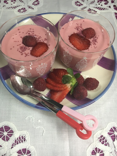Se enfría en la nevera y se sirve adornada con fresones laminados o frambuesas.