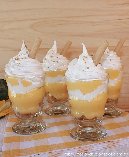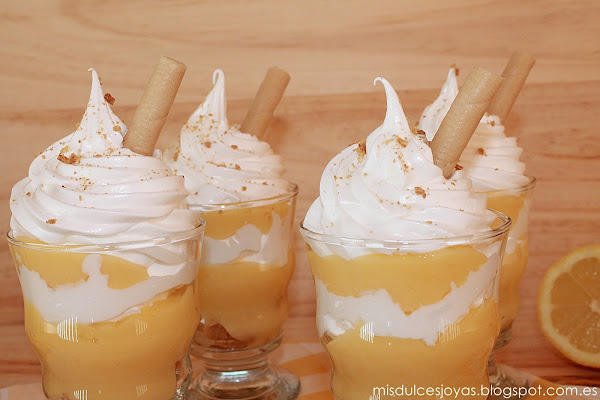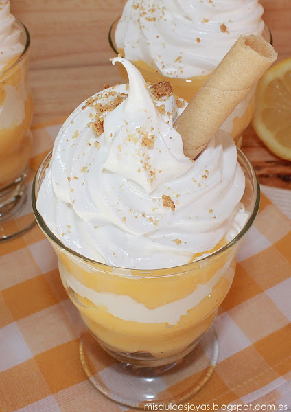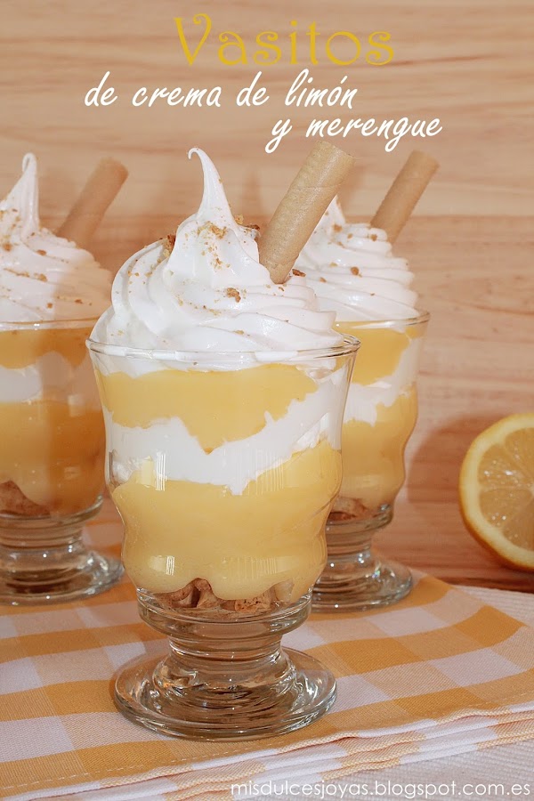 Por ese motivo la tarta inglesa de limón y merengue "Lemon Pie", es una de mis favoritas. La receta de esta tarta era una de las primeras que puse en el blog, y estos vasitos son realmente una versión de la misma. Se componen de unas capas de Lemon Curd (crema de limón inglesa), merengue y galleta desmenuzada. La galleta hace la función de la masa quebrada, que es la base de esta tarta. La verdad aunque parecen sencillos y simples os diré que están riquísimos, y no necesitan nada más, cualquier añadido les sobra.