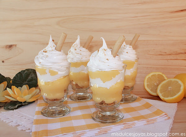En el fondo de los vasitos o las copas disponer una capa de galletas. Cubrir con dos o tres capas de crema de limón y merengue, es recomendable que la última capa sea merengue.
