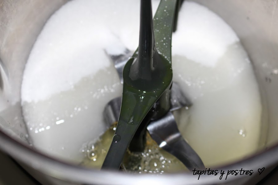Echamos todos los ingredientes del merengue en el vaso de la thermomix y montamos 4 minutos a 50º, velocidad 3 ½.