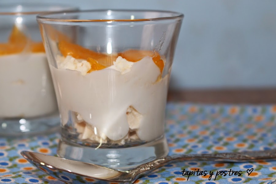 Vamos a montar los vasitos, ponemos en el fondo del vasito un trozo de merengue horneado pero troceado, en migas gruesas. Echamos crema de merengue y otra vez migas de merengue horneado. Acabamos poniendo unos trozos de melocotón caramelizado. Dejamos en la nevera para que la crema se enfríe antes de servir.