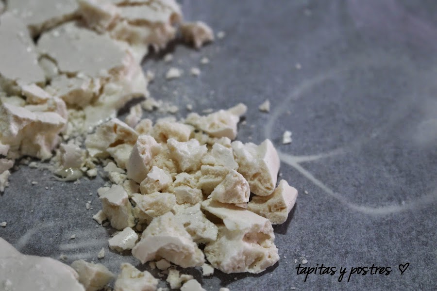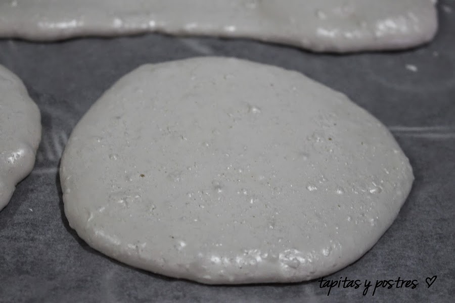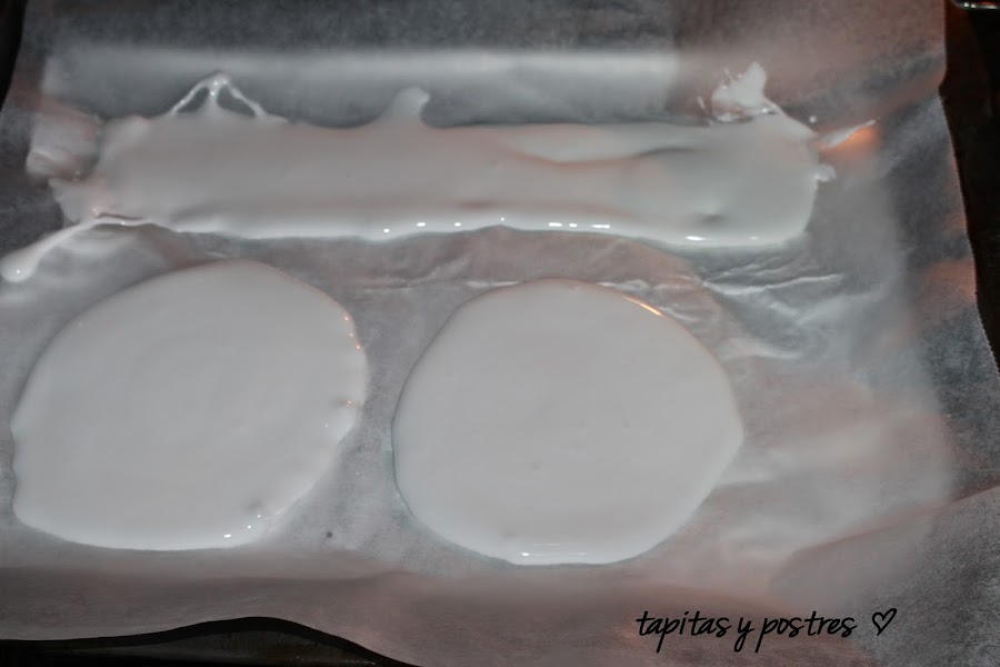 Precalentamos el horno a 100º y sobre la bandeja, ponemos papel de horno y extendemos parte de la crema de merengue, dejando al menos un vaso reservado.