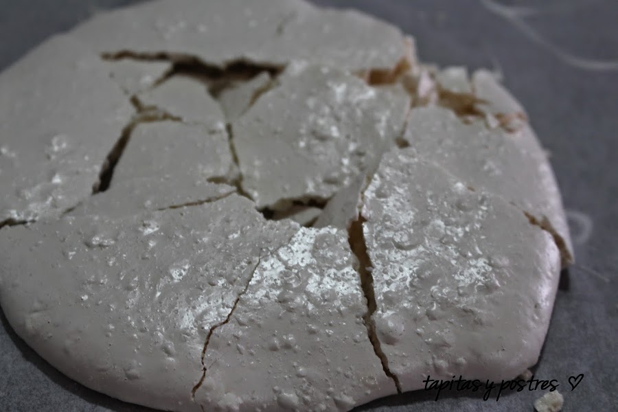 Reservamos un vaso de la crema y el resto lo ponemos en el horno sobre papel de hornear, no importa la forma que le deis, aquí se ve redonda porque era mi intento de hacer una paulova. Lo horneamos a baja temperatura y dejamos que se enfríe en el horno.