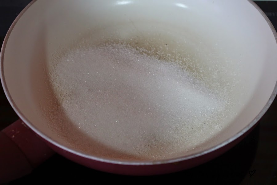 Ahora vamos a caramelizar el melocotón. Ponemos el azúcar en una sartén antiadherente.
