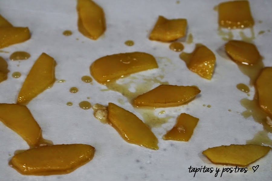 Ya tengo caramelizado el melocotón, saco mis discos del horno con cuidado, intento desmoldarlos del papel y ? ¡se rompen! Segundo fracaso.