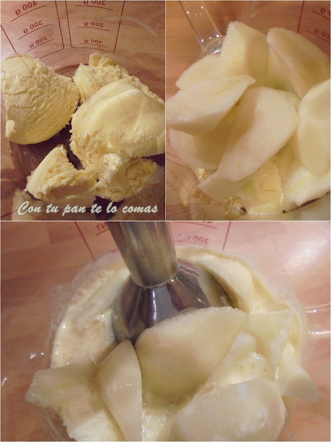1. En el vaso de la batidora ponemos el helado de vainilla (sácalo un poco antes del congelador), las peras troceadas, el zumo de limón y el vasito de leche.