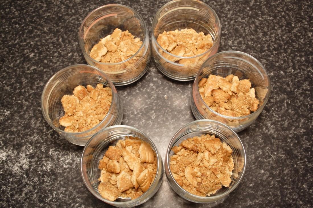 Machacamos las galletas en un mortero (no importa que queden trozos de diferentes tamaños). Las pasamos a un bol pequeño y añadimos la mantequilla fundida, mezclamos bien y repartimos en los vasitos.