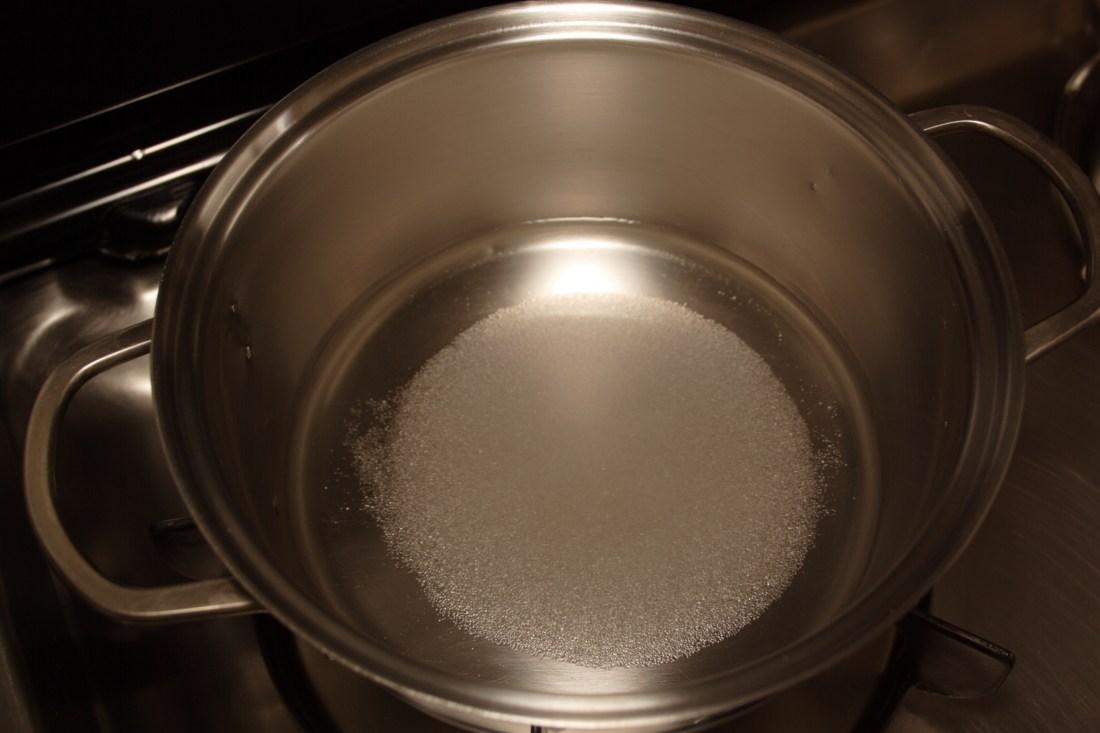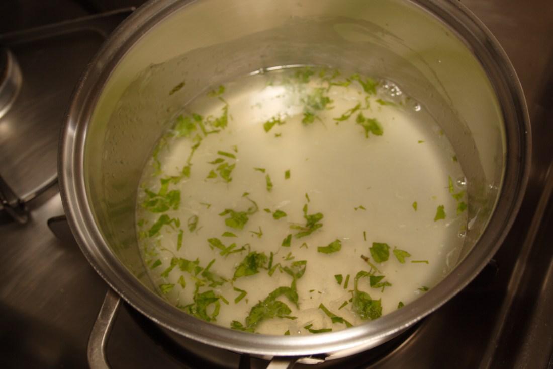 Ponemos a calentar el agua en un cazo junto con 25 gr de azúcar (reservamos el resto). Cuando se caliente, escurrimos bien la gelatina y la agregamos. Removemos bien hasta que se disuelva, retiramos el cazo del fuego y añadimos el zumo de 2 limas y 2-3 hojas de menta picaditas (éstas últimas cuando se enfríe del todo), removemos y dejamos reposar hasta que se temple.