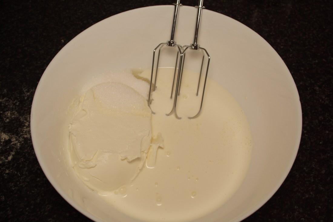 En un bol amplio ponemos el queso, la nata (crema de leche) y el resto del azúcar. Montamos con las varillas eléctricas.