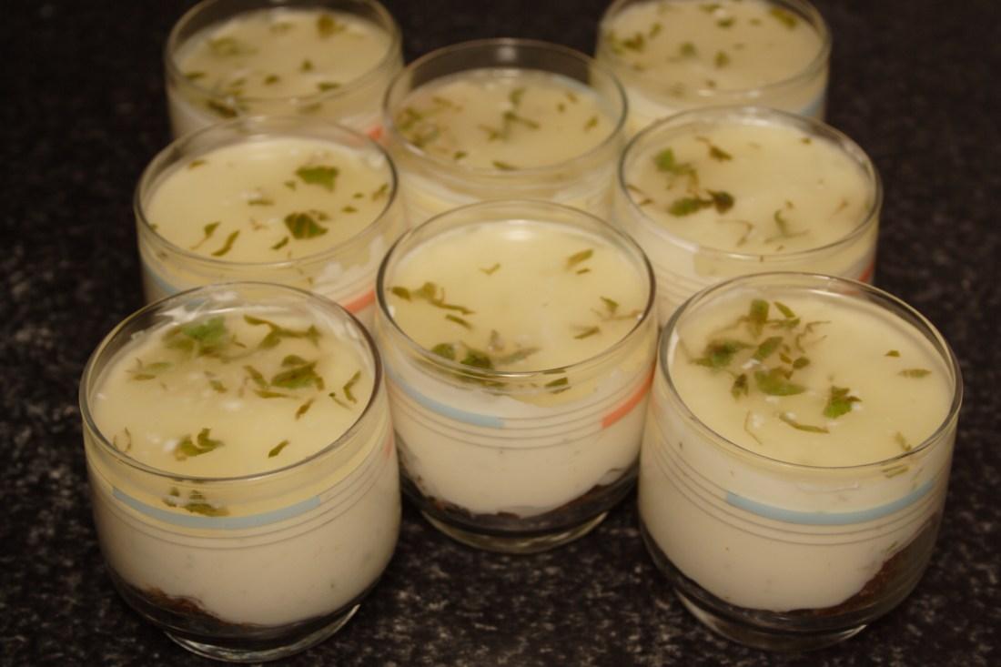 Vertemos la gelatina de lima y menta reservada en los vasitos, sobre la crema de queso e introducimos los moldes en el frigorífico hasta que la gelatina solidifique.