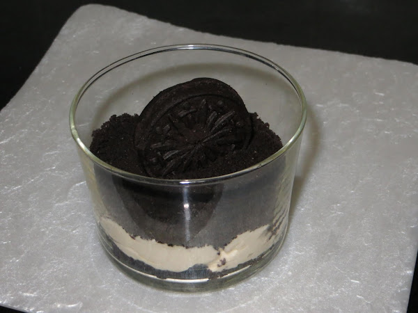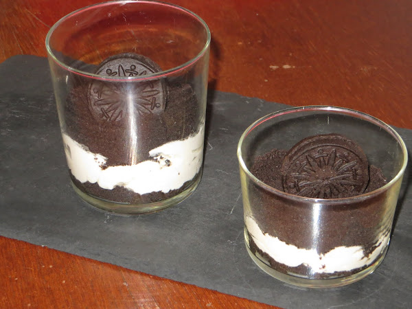 Ahora sólo queda montar nuestros vasos, se pone en el fondo el polvo de galletas, luego una capa de crema y para terminar más polvo de nuestra galleta. Para decorar se coloca una galleta tipo Oreo y ya tenemos nuestros vasitos, también podéis hacer más copas con crema y polvo de galleta eso os lo dejo a vuestro gusto.