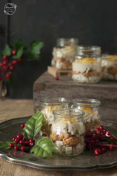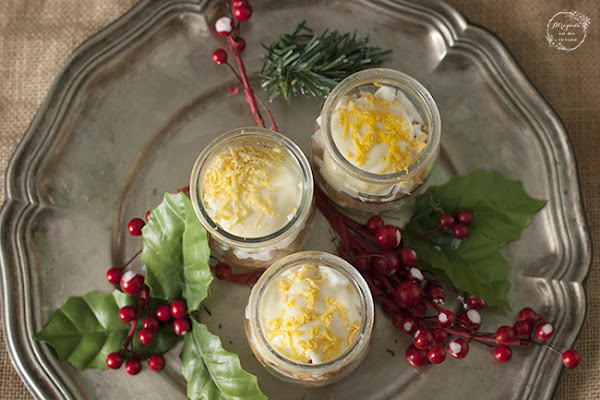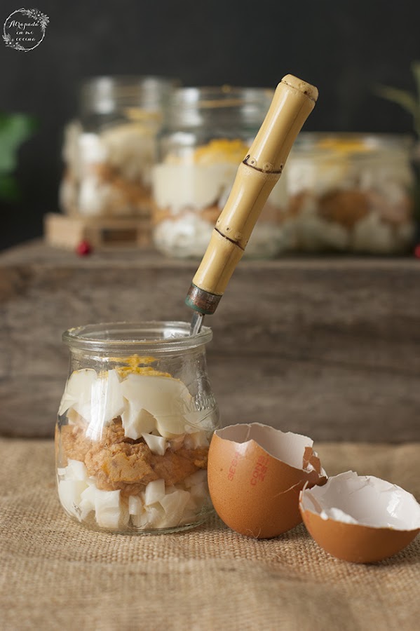 Podéis usar para la presentación vasitos o tarros de conservas reciclados, con esta última opción se conservan estupendamente porque se guardan con su tapa. Lo pongáis donde lo pongáis la forma de montarlo es la misma. Picamos media clara de huevo y la ponemos en el fondo del tarro. El relleno lo metemos en una manga pastelera para que sea más fácil repartir en los vasitos y vamos distribuyendo uniformemente. Picamos la otra mitad de la clara del huevo y tapamos el relleno con ella. Por último introducimos la mayonesa en una manga pastelera y coronamos cada vasito con un pegote. Decoramos con yema de huevo rallada por encima. Enfriamos un ratito en la nevera y servimos.
