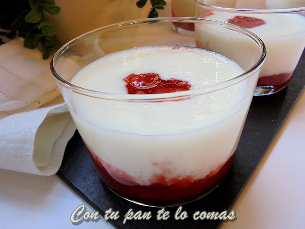 Llenamos los vasitos con la mezcla de requesón y terminamos con una cucharadita de la mermelada de fresas en el centro. Llevamos a la nevera para que esté fresquito.