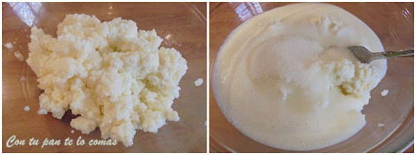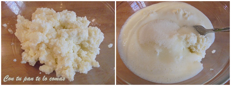 3. Mezclamos el requesón con la leche kefirada y el resto del azúcar. A mi me parece suficiente azúcar pero puedes probarlo y añadir más si te parece poco dulce.