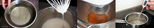 Preparar un almíbar con 50 g de azúcar y 50 g de agua, calentándolos al fuego hasta que alcance una temperatura de 114º (punto de bola). Retirar del fuego y verter, muy poco a poco, sobre las yemas de huevo con las varillas en marcha y a velocidad media, para que el almíbar se mezcle con las yemas pero sin cocerlas. Seguir batiendo a velocidad alta hasta enfriar del todo, hay que conseguir una crema espumosa y de color pálido.