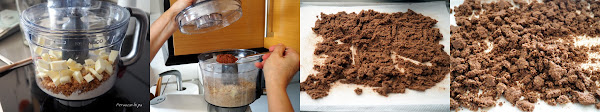 Colocarlas en un procesador junto con la harina, el azúcar y la matequilla cortada en pequeños dados. Mezclar primero estos ingredientes y añadir después el cacao y volver a mezclar.