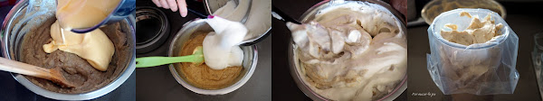 Incorporar primero las yemas montadas, mezclando con movimiento suaves y envolventes y, cuando se haya integrado, añadir la nata (crema de leche) semi-montada mezclando de igual forma, con movimientos envolventes.
