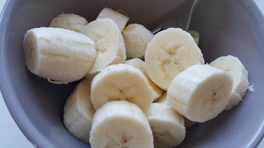 Pelamos y troceamos un plátano y medio. Reservamos el otro medio para decorar.