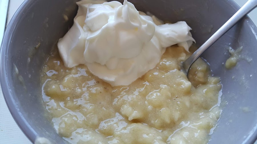 Una vez tengamos el plátano bien machacado con la ayuda de un tenedor, agregamos los yogures y mezclamos bien. Si veis que os quedan grumos lo podéis para por la batidora.