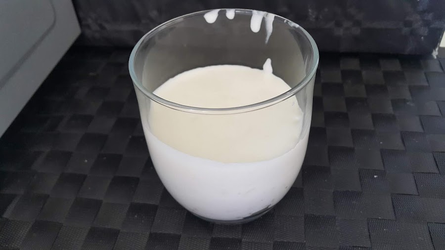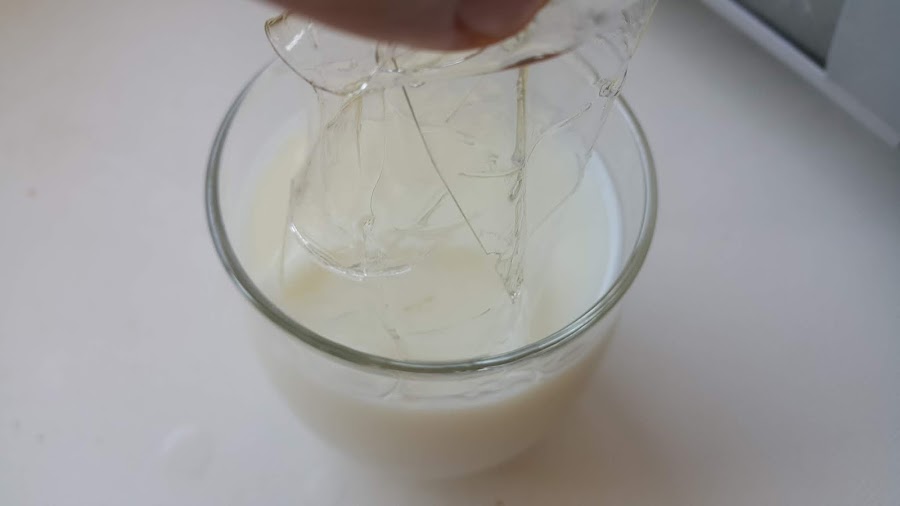 Calentamos el vaso de leche en el microondas un par de minutos a media potencia. Una vez la leche esté caliente agregamos las hojas de gelatina una a una y bien escurridas.