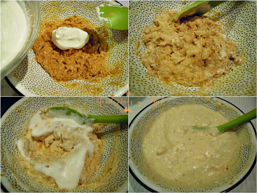 Ves añadiendo poco a poco la nata montada (crema de leche), primero una cucharada y lo mezclas bien con movimientos lentos y envolventes, luego termina de añadir el resto de nata (crema de leche), mezcla todo con una lengua de silicona para evitar que la nata (crema de leche) se baje.