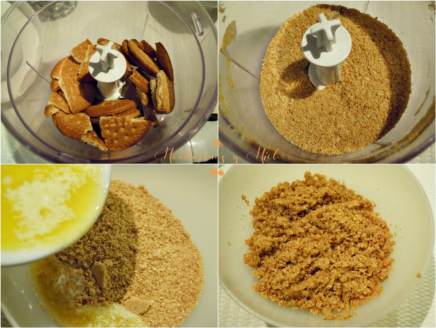 Haz una base de galletas en los vasitos que vayas a utilizar, apretando para que quede compacta, yo he utilizado la base de una copa de cristal para compactar e igualarla. No la pongas toda, guarda un poco para añadirla después.