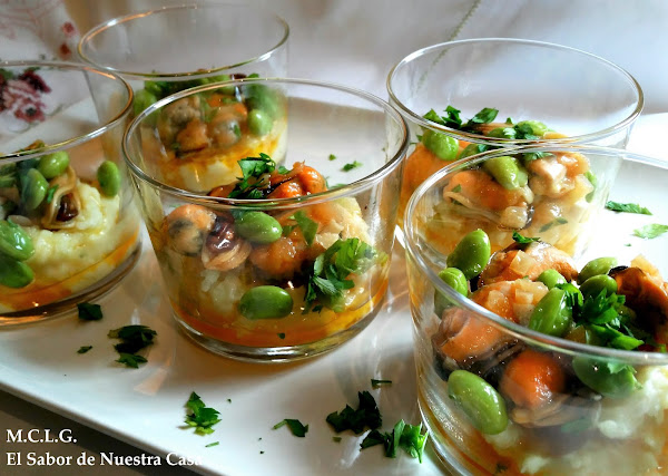 Monta el aperitivo: pon el puré en el fondo, encima los mejillones y por último los edamames.