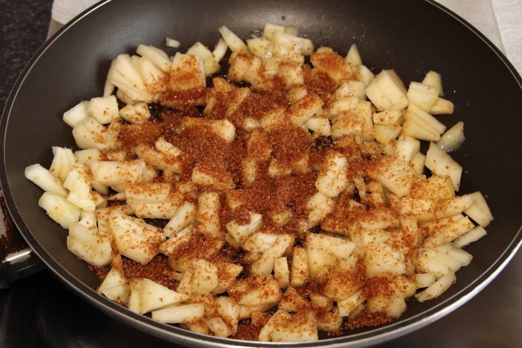 Pelamos y cortamos en daditos las peras, las pasamos a una sartén junto con el aceite, la canela y el azúcar moreno. Ponemos a fuego suave y las caramelizamos hasta que estén tiernas. Retiramos del fuego y dejamos enfriar.