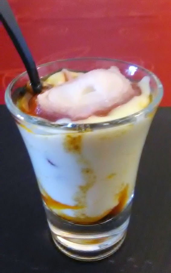 Para la elaboración de los vasitos de pulpo a la gallega hemos empleado un aceite de oliva virgen extra de la varidad Picual de La Sahita, qué le ha dado el punto perfecto de sabor tanto al pulpo como a la crema de patata.