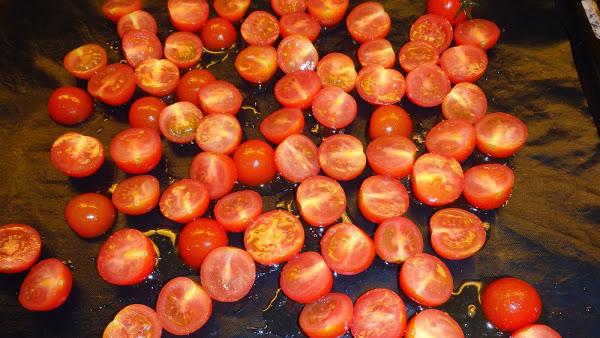 Disposem els tomàquets en una safata de forn i els coem durant uns 35 minuts, ja sabeu, cada forn és un món! Un cop ja estiguin els traiem del forn i els deixem refredar.