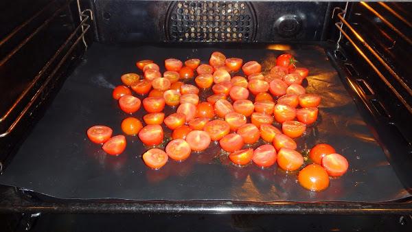 Disponemos los tomates en una bandeja de horno y los cocemos durante unos 35 minutos, ya sabéis, ¡cada horno es un mundo! Una vez ya estén los sacamos del horno y los dejamos enfriar.