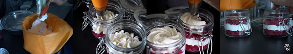 Colocar la mousse en una manga pastelera, es la forma más rápida y cómoda para repartirla en los vasitos que vamos a montar. Aquí hemos utilizado una boquilla estriada que dibuja unas rosas perfectas.