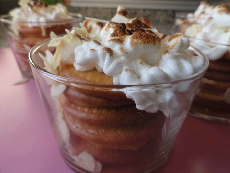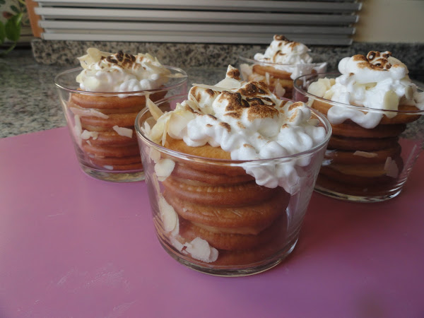 Con la clara de huevo que tenemos reservada montamos un merengue bien fuerte. Ponemos en cada vasito un poco del merengue y quemamos con el soplete. Unas láminas de almendra por encima y dejamos que repose unas horas, para que las galletas estén blanditas. Esta buenísima, aunque es superconocida si alguien no la ha probado que lo haga que no se arrepentirá...