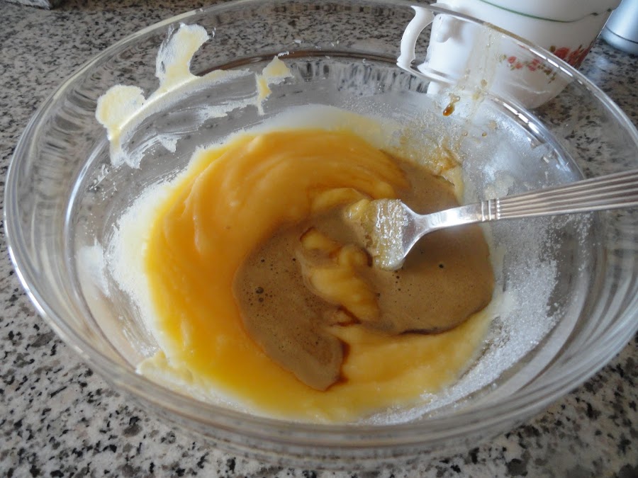 Dejamos la mantequilla a temperatura ambiente, o calentamos un poco en el microondas, que esté en punto pomada. Mezclamos con azúcar glas, una cucharada o más o menos, según lo dulce que lo queramos. Separamos la clara de la yema y añadimos la yema del huevo, y mezclamos bien, incorporamos el café o descafeinado que hacemos como tengamos costumbre, pero intentar coger solo lo primero que salga si es cafetera expres, para que esté muy concentrado el sabor. Mezclamos todo bien.