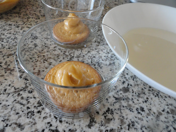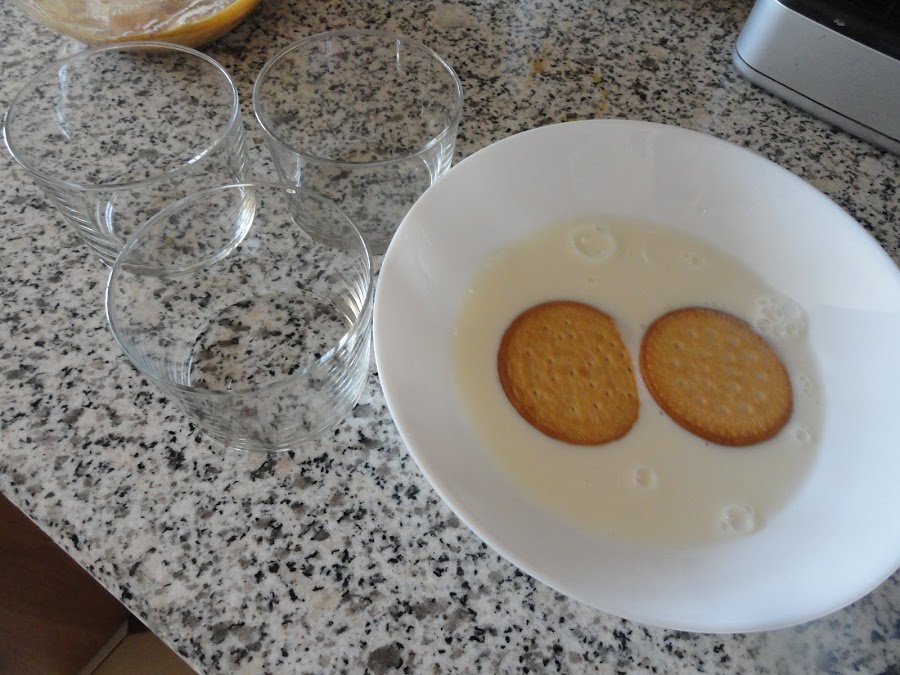 En un plato mojamos una galleta para cada vasito, rápido que no se empapen demasiado, porque aunque parezcan duras, con sólo pasarlas por la leche luego se reblandeden. Encima de cada galleta ponemos un poquito de la mezcla en el centro, encima otra galleta y así vamos alternando. A mi me dio la masa para subir seis galletas en cada vasito.