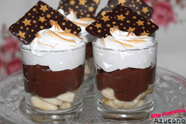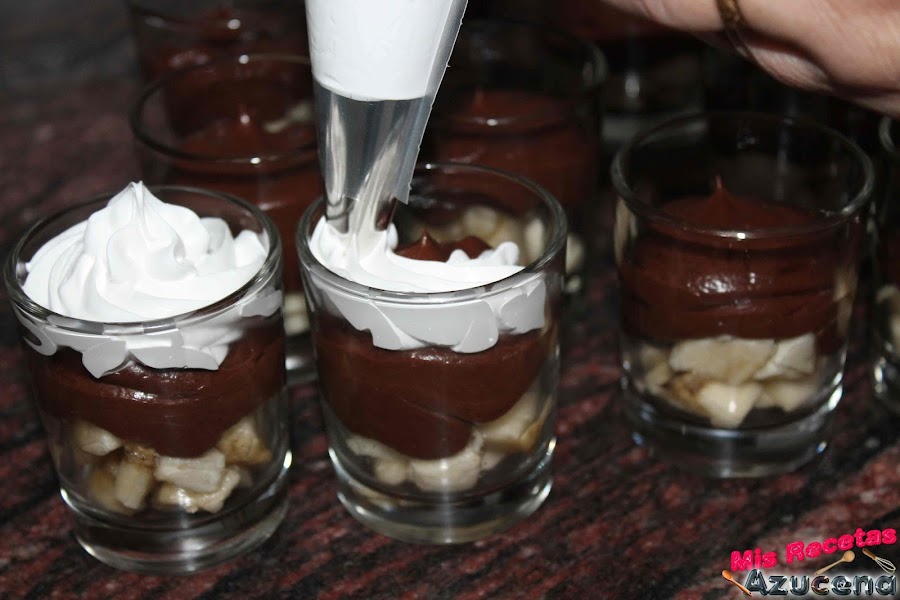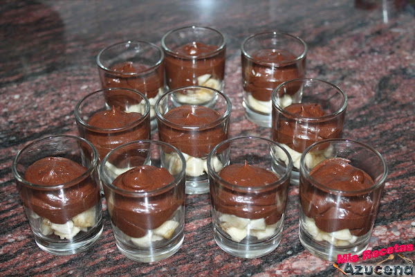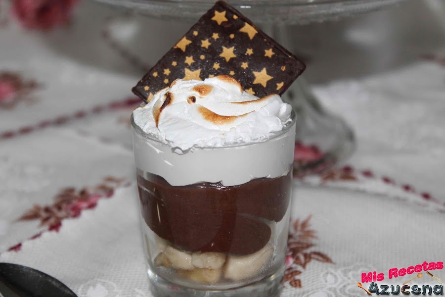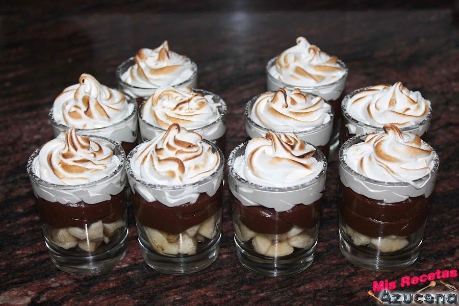 Cogemos los vasitos que tengamos pensado presentar, en el fondo del vaso le pondremos trocitos de plátano, después continuaremos con una capa de chocolate y por ultimo le pondremos una capa de merengue, estos pasos los haremos con todos los vasos a la vez de esta manera repartiremos bien el plátano por todos al mismo tiempo.