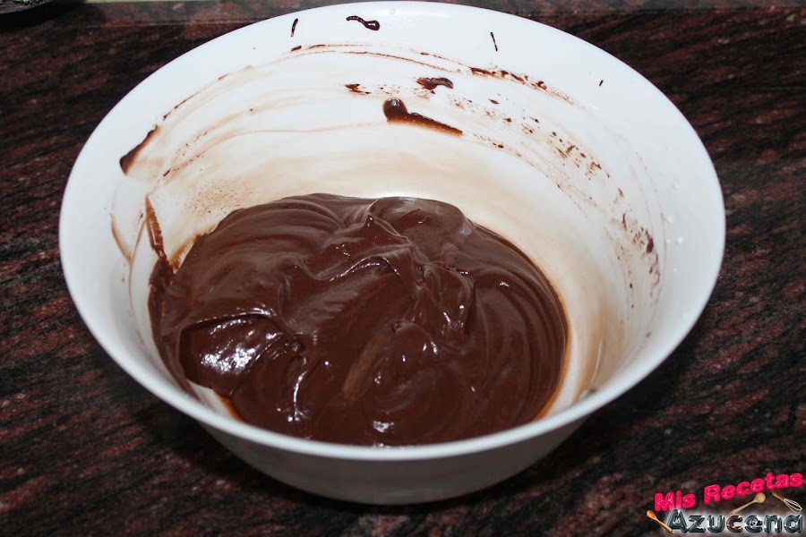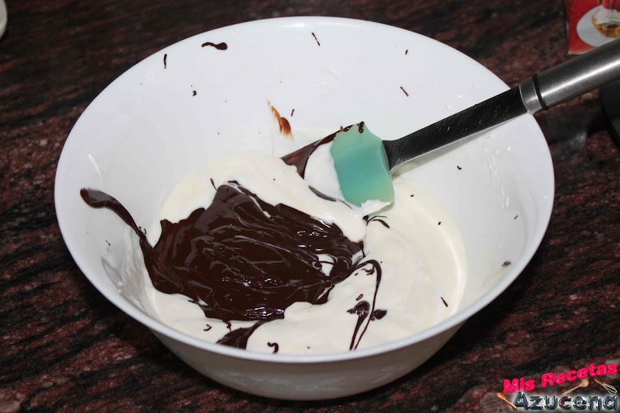 Ahora añadiremos el chocolate que ya lo tendremos frio y volvemos a mezclar con cuidado, una vez este todo bien mezclado reservaremos.
