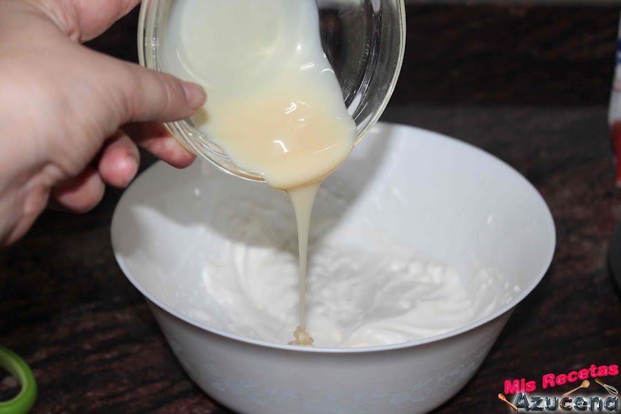 Mientras se enfría montaremos la nata (crema de leche) con ayuda de unas varillas eléctricas, cuando tengamos la nata montada (crema de leche) añadiremos la leche condensada, la mezclaremos con cuidado.