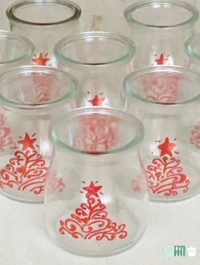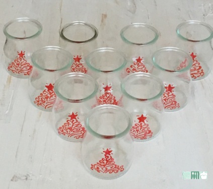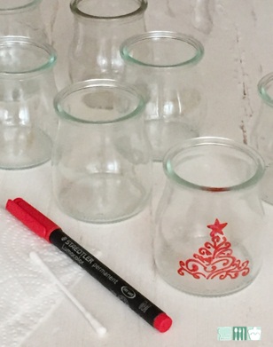 Si no lo hacéis a mano alzada, colocar la plantilla dentro del vaso y "calcar" el dibujo por fuera. Los rotuladores que yo empleé se borran con el lavavajillas, listos para cambiar el dibujo.