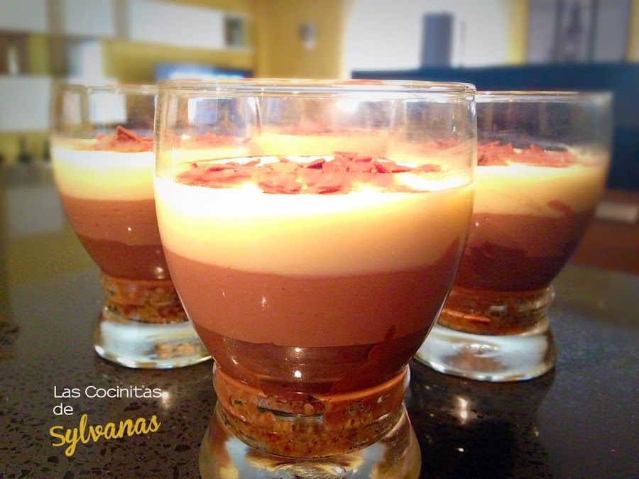 Ponemos en una caza al fuego el chocolate negro con 100 ml de nata (crema de leche), 100 ml de leche, 30 gr de azúcar y 6 gr de cuajada. Removemos sin parar hasta que empiece a espesar y repartimos entre los vasitos y reservamos en la nevera.