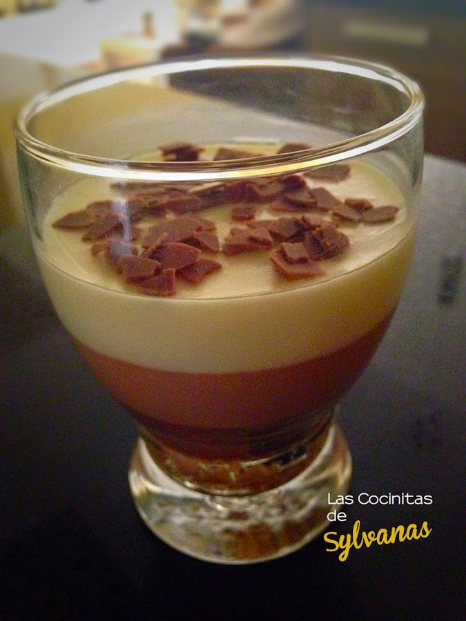 Volvemos a repetir el paso del chocolate negro, pero esta vez con el chocolate blanco, sin añadirle azúcar. Repartimos con cuidado en los vasitos y reservamos en la nevera. Una vez este totalmente frío decoramos con escamas de chocolate negro por encima.