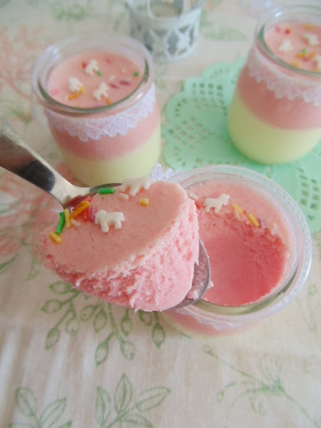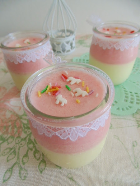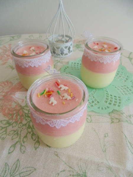 Repetimos los mismos pasos con el sabor de fresa y dejamos reposar unas horas. Desmoldamos con ayuda de una puntilla si habéis usado molde y con los vasitos pues sencillamente decoramos con nuestros caramelitos y listo!