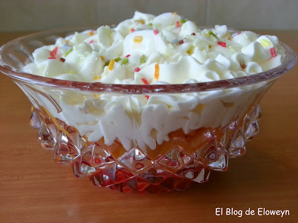Una vez puesta la crema, meterlo otra vez en la nevera y dejadlo hasta el día siguiente. Podéis ponerle por encima algún adorno justo antes de servir. Yo le puse fideos de colores.