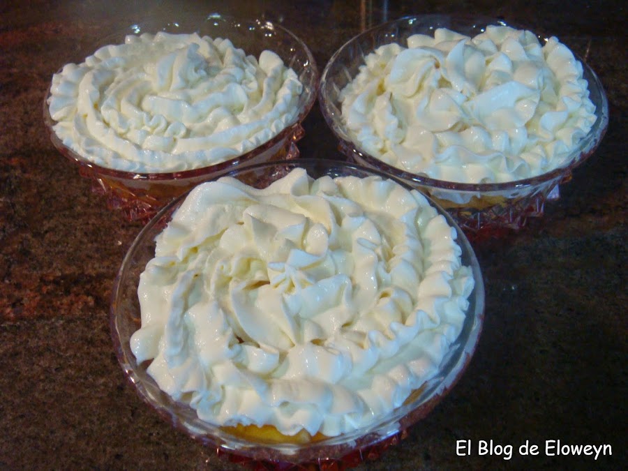 Poner la manga pastelera en la nevera durante unas 3 horas. De esta forma, la crema espesará un poquito (tampoco es para tirar cohetes...) y podremos ponerla por encima del postre dándole algo de forma. Se ha de ir con mucho cuidado que no se caliente la crema, porque si no, se volverá más líquida (este es uno de los problemas que tuve con la receta original... que no la puse unas horas en la nevera, porque la receta no lo indicaba y conforme iba poniéndola sobre el melocotón iba "despachurrándose" sin control) O sea, que cuidadín con la crema.