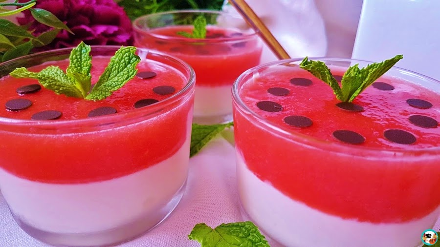 Para endulzar las comidas tengo hoy un postre fácil, fresco con fruta de temporada; unos vasos de yogur griego con gelatina de sandía.